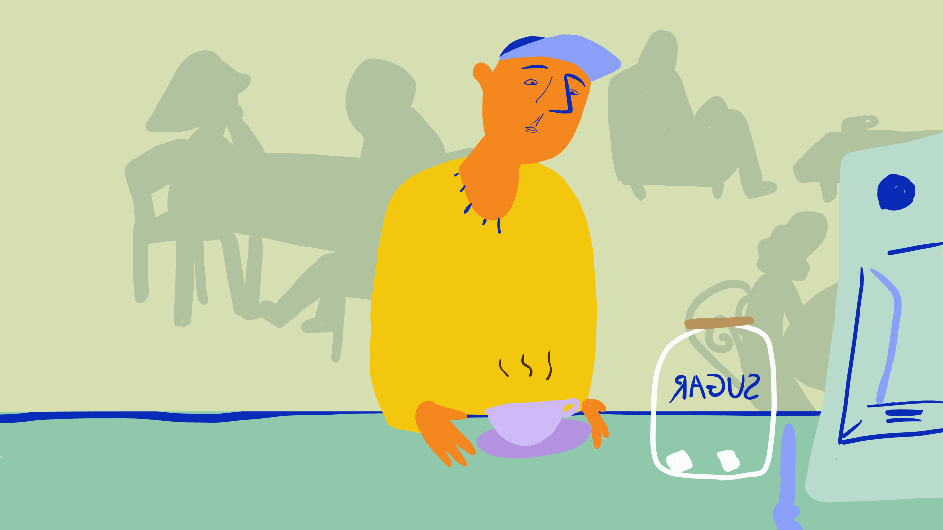 the video uses a busy cafe to draw a parallel with a person’s busy mind. its main character, frida, struggles with multitasking and dealing with stress because other thoughts and future plans/tasks constantly distract her.